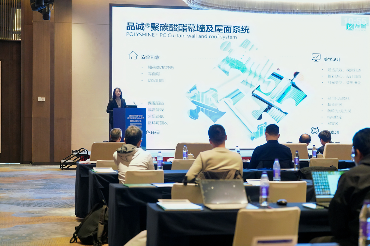 作为行业领先企业,品诚受邀出席并发表专题演讲,系统阐述了品诚®聚碳酸酯系列幕墙及屋面系统如何在安全、绿色、美学与综合性能间实现系统化平衡,为提升城市建筑安全韧性提供了创新思路与扎实支撑。